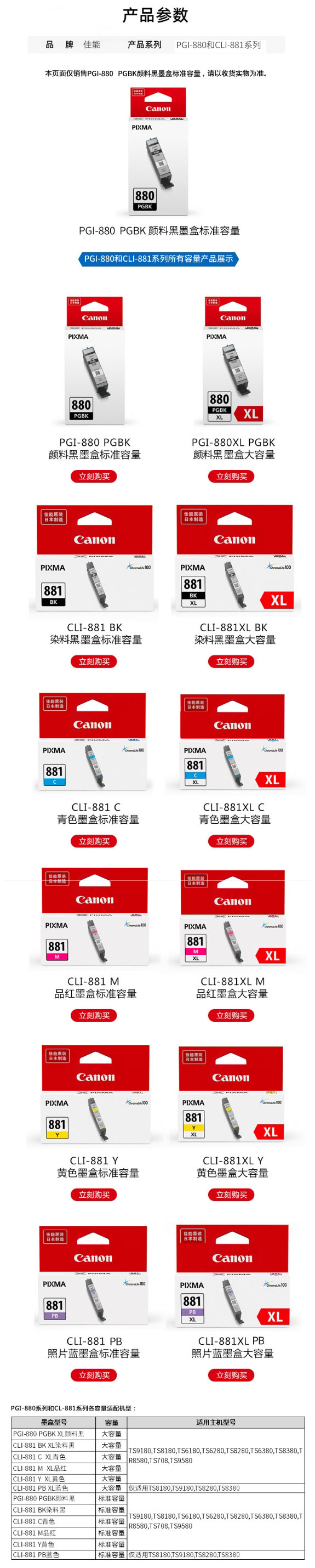 商品名称:佳能(Canon)CLI-881XL BK 大容量黑色墨盒(适用TS9580/TS9180/TS8380/TS708t/TS708/TS6380/TR8580)