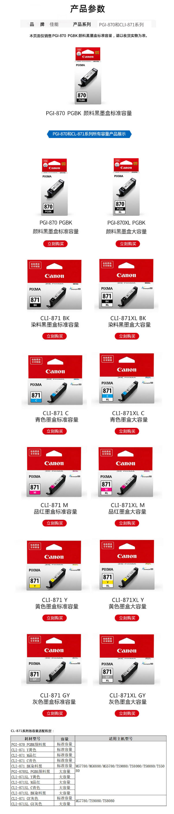 商品名称:佳能(Canon)CLI-871XL C 大容量青色墨盒(适用MG7780/TS9080/TS8080/TS5080)